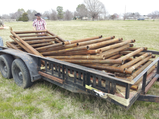 Unloading VSP Trellis for vine wire. Average weight 300 lbs. Hole for each nine inches each. Will encompass an acre and a half. Copyright 2015 John J. Rigo, Stewart-Rigo Winery in Eustace, Texas.